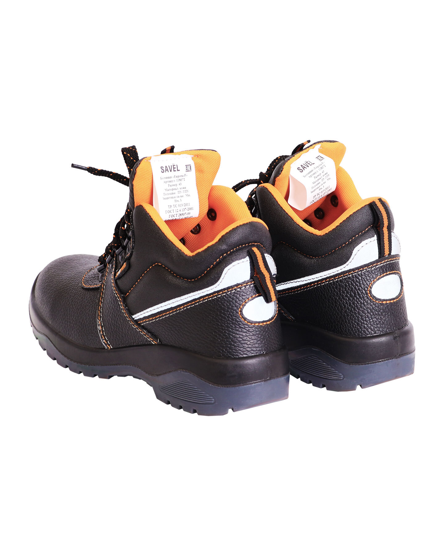 Верх обуви изготовлен из кожи со специальным покрытием для защиты от ОПЗ, МВ, МВО. Застежка на шнурок и металлические петли. Подошва двухслойная ПУ/ТПУ: полиуретан обладает амортизирующими свойствами, гасит ударные нагрузки, а также придает обуви лёгкость, комфорт и повышенные теплозащитные свойства. Термополиуретан обладает гибкостью и прочностью, поэтому обувь с подошвой из этого материала прослужит долго. Литьевой метод крепления подошвы обеспечивает с верхом обуви единое целое, в результате достигается полная герметичность в месте литья. Такой метод крепления является самым прочным и долговечным на сегодняшний день. Подошва сохраняет свои свойства в широком диапазоне температур и обладает стойкостью к воздействию масел, сырой нефти, нефтепродуктов. Подклад в ботинках серии "SAVEL-Европа" оранжевого цвета и выполнен из воздухопроницаемого нетканого материала «типика», который обеспечивает комфортный микроклимат, быстро сохнет и имеет высокую степень устойчивости к истиранию. Верх ботинка имеет контрастные отделочно-скрепляющие строчки оранжевого цвета, как и подкладка, а также световозвращающие вставки для лучшей видимости в тёмное время суток. Колодка обладает полнотно-размерными характеристиками защитной обуви, предназначенной для эксплуатации в летний и весенне-осенний периоды, даёт возможность работать полный рабочий день с комфортом и без усталости. Обувь предназначена для работы в нефтегазовой, горнодобывающей, энергетической, химической промышленности, на транспорте, в агропромышленном комплексе и сервисных службах. Защитные свойства и соответствие ГОСТам указаны в сертификате