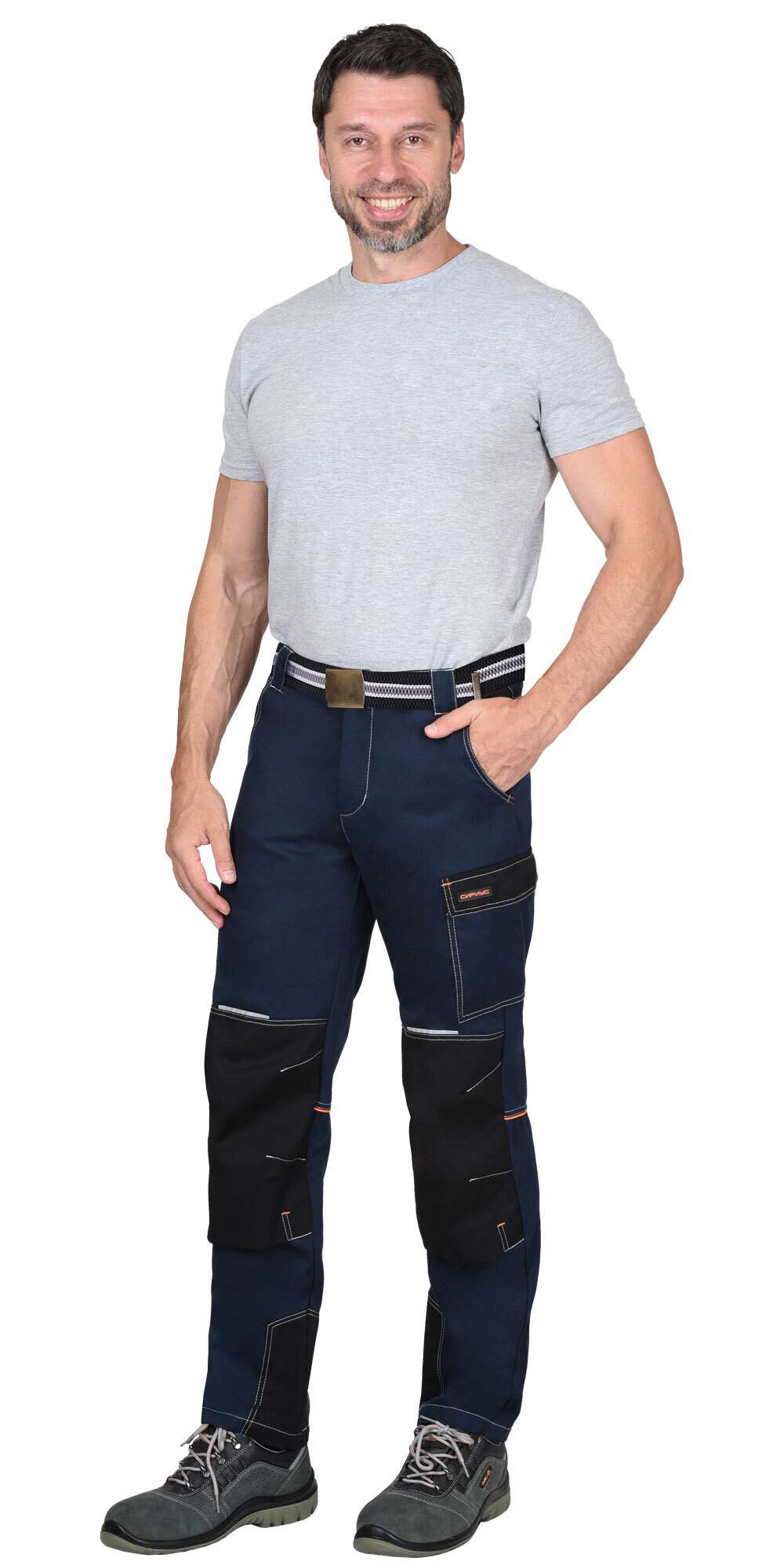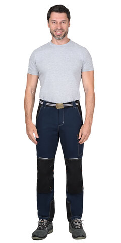 Брюки летние со съемным ремнем из смешанной ткани «Карелии-260» с водоотталкивающей пропиткой. Брюки с застежкой гульфика на молнию. Передние половинки с боковыми внутренними карманами и объемными наколенниками. На левом боковом шве накладной полуобъемный карман с фигурным клапаном на липучку. Задние половинки с кантом контрастного цвета, кокеткой и накладными фигурными карманами. По шаговым швам брюк усиленные фигурные накладки. Пояс брюк с широкими шлевками.