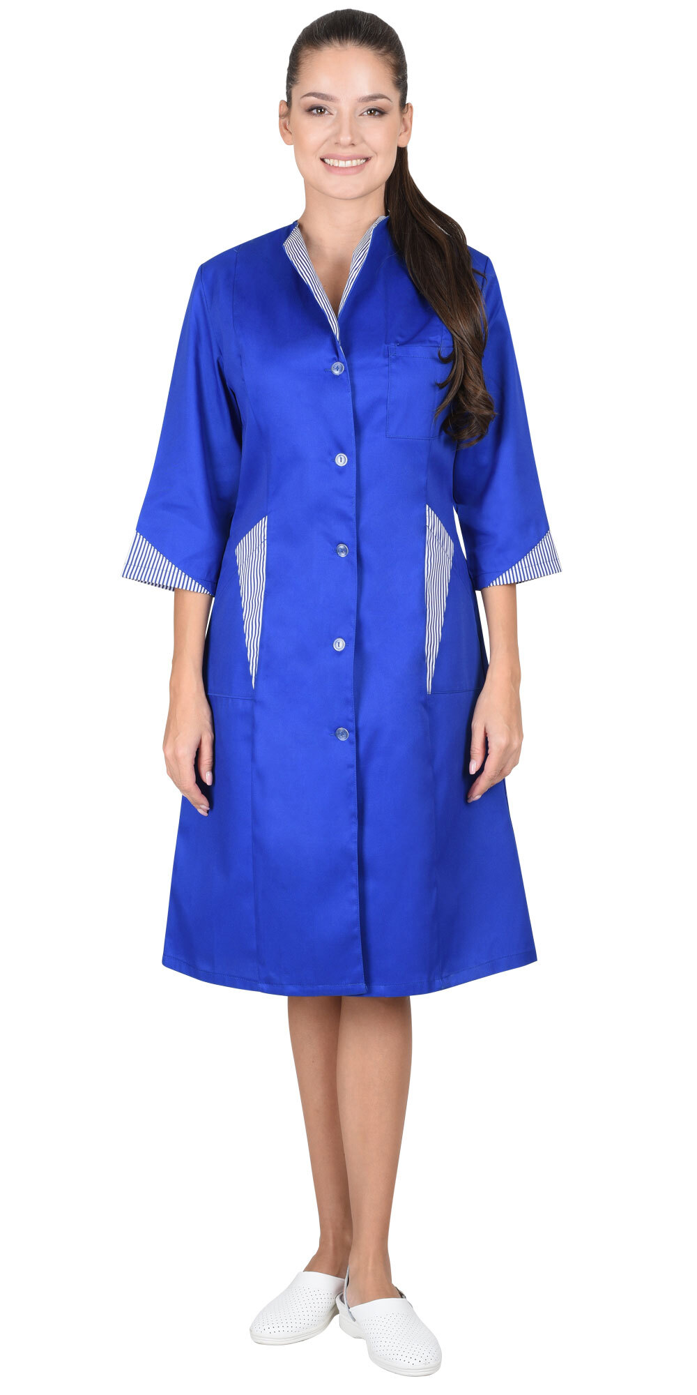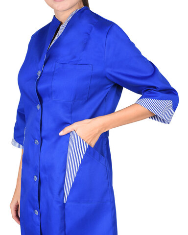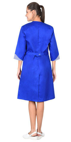 Халат полуприлегающего силуэта, слегка расширенный к низу. Застёжка на пуговицы, рельефы. Воротник, часть нижних карманов и низ рукавов 3/4 из отделочной ткани. ГОСТ 12.4.131-83