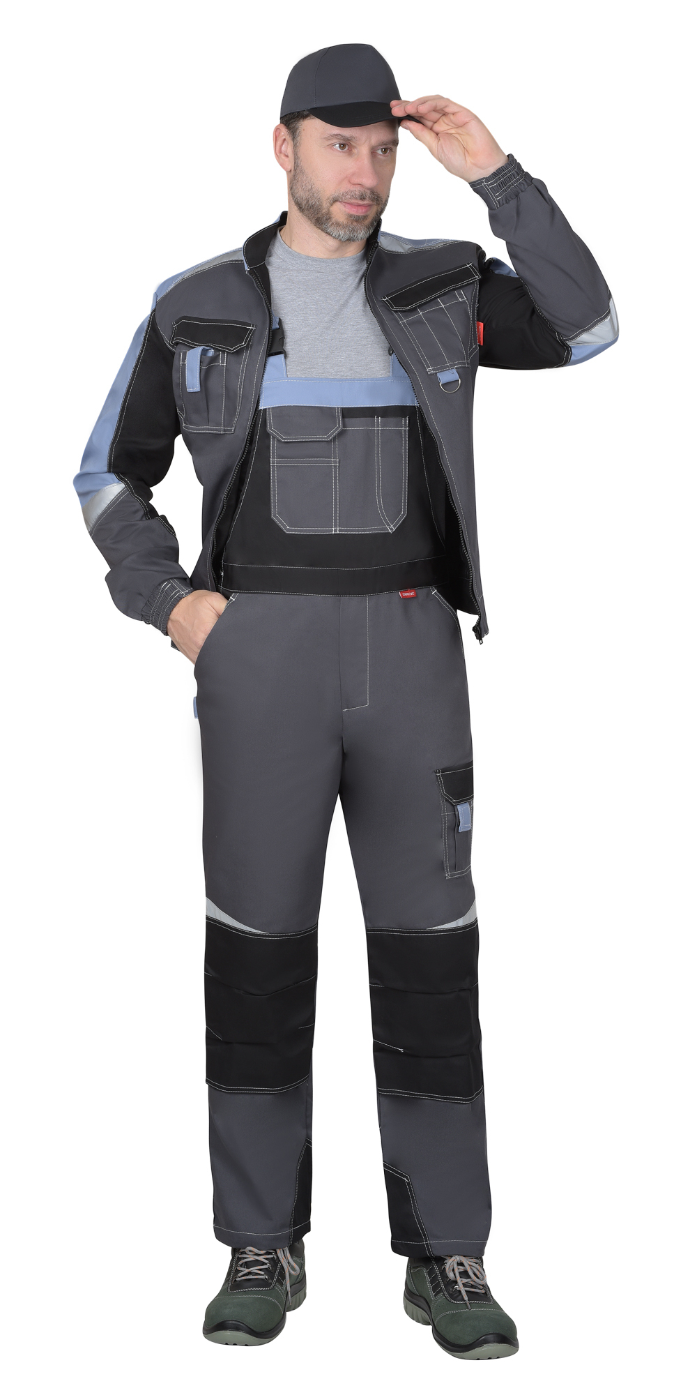 Полукомбинезон с застежками: гульфик на молнию, левая боковая на пуговицы. На грудке многофункциональный карман с клапаном на липучку. На левом боковом шве накладной функциональный карман с клапаном на липучку. Задние половинки с накладным карманом и карманами для инструментов. По спинке резинка для лучшего прилегания. Полукомбинезон с бретелями, длина регулируется резинкой и застежкой-фастексом. По шаговым швам усилительные фигурные накладки.