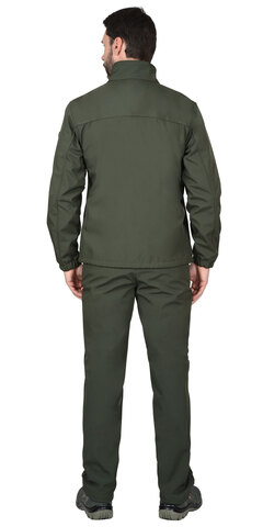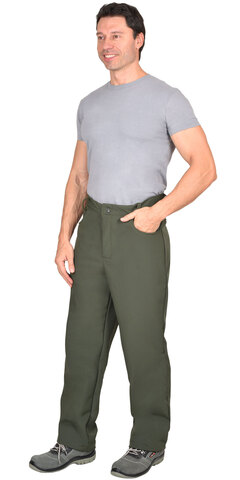 Брюки прямые, на притачном поясе, с застёжкой спереди гульфик на тесьму «молния». Брюки с боковыми внутренними карманами фигурным входом, на задних половинках с отрезной кокеткой. Ткань верха - «Софтшелл» состав: 100% п/э.; пл. 350 г/м ГОСТ 25295-2003