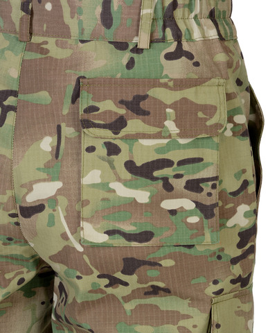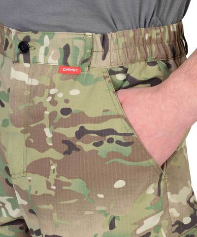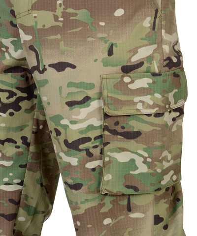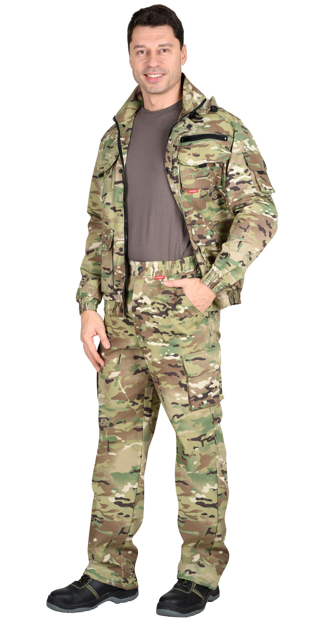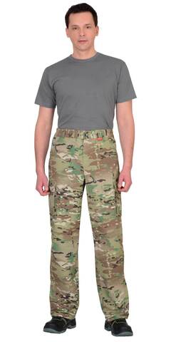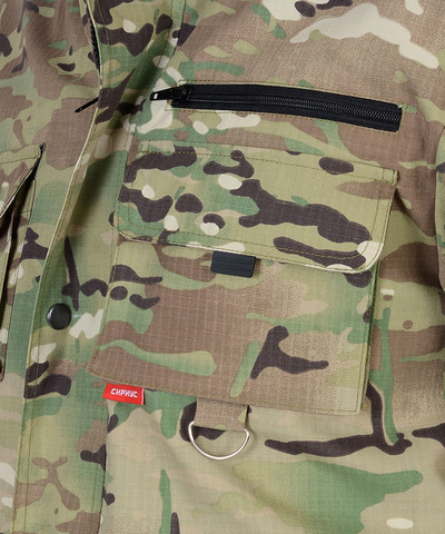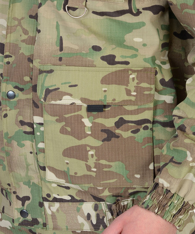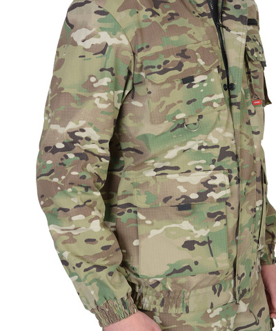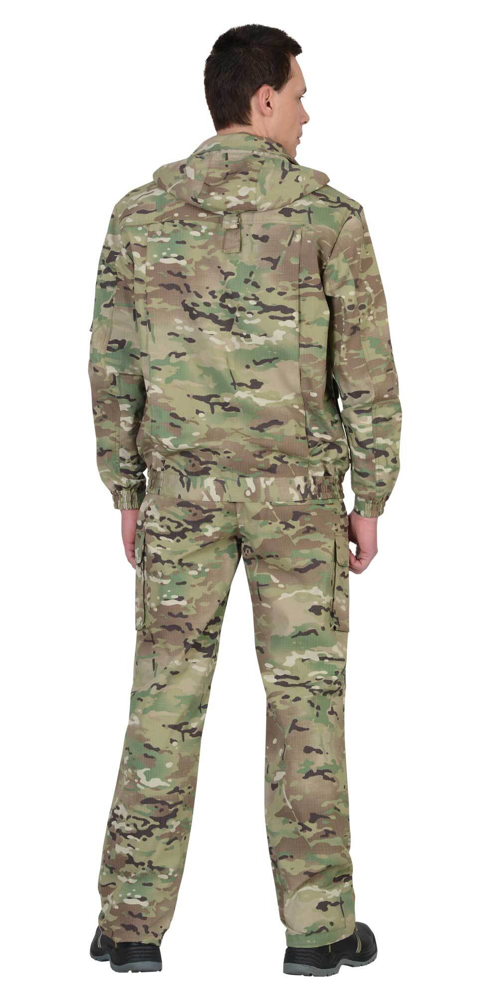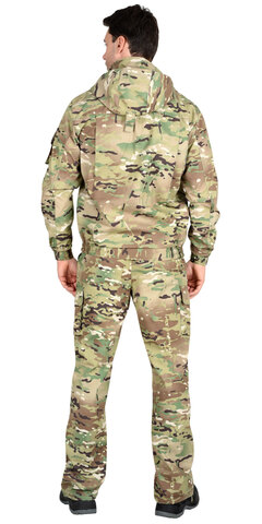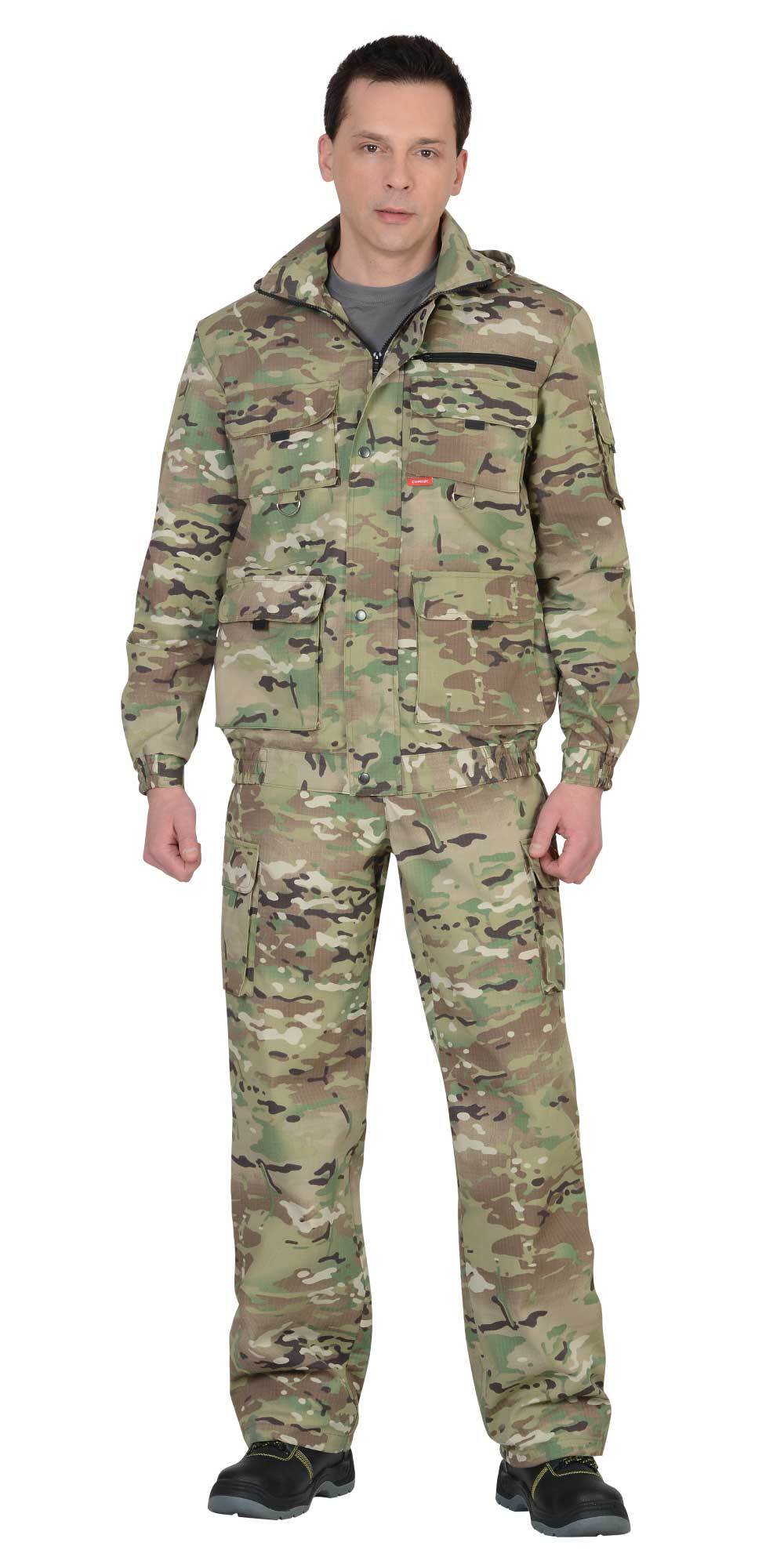 Куртка короткая, прямого силуэта, с центральной застёжкой на молнию накрытой ветрозащитным клапаном, воротник стойка, пристёгивающимся капюшоном, различными многофункциональными накладными карманами с клапанами. Рукава с манжетами и патой регулирующий ширину. Низ куртки с притачным поясом стянутым, частично, резинкой.Брюки прямые с притачным поясом стянутым, частично резинкой и застёгивающимся на пуговицу, со шлёвками, застёжкой гульфика на молнию, с различными функциональными карманами. Низ брюк регулируется эластичным шнуром.Ткань: "Рип-Стоп", ВО, 65% п/э., 35% х/б, 215 г/кв.м.ГОСТ 12.4.280-2014