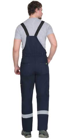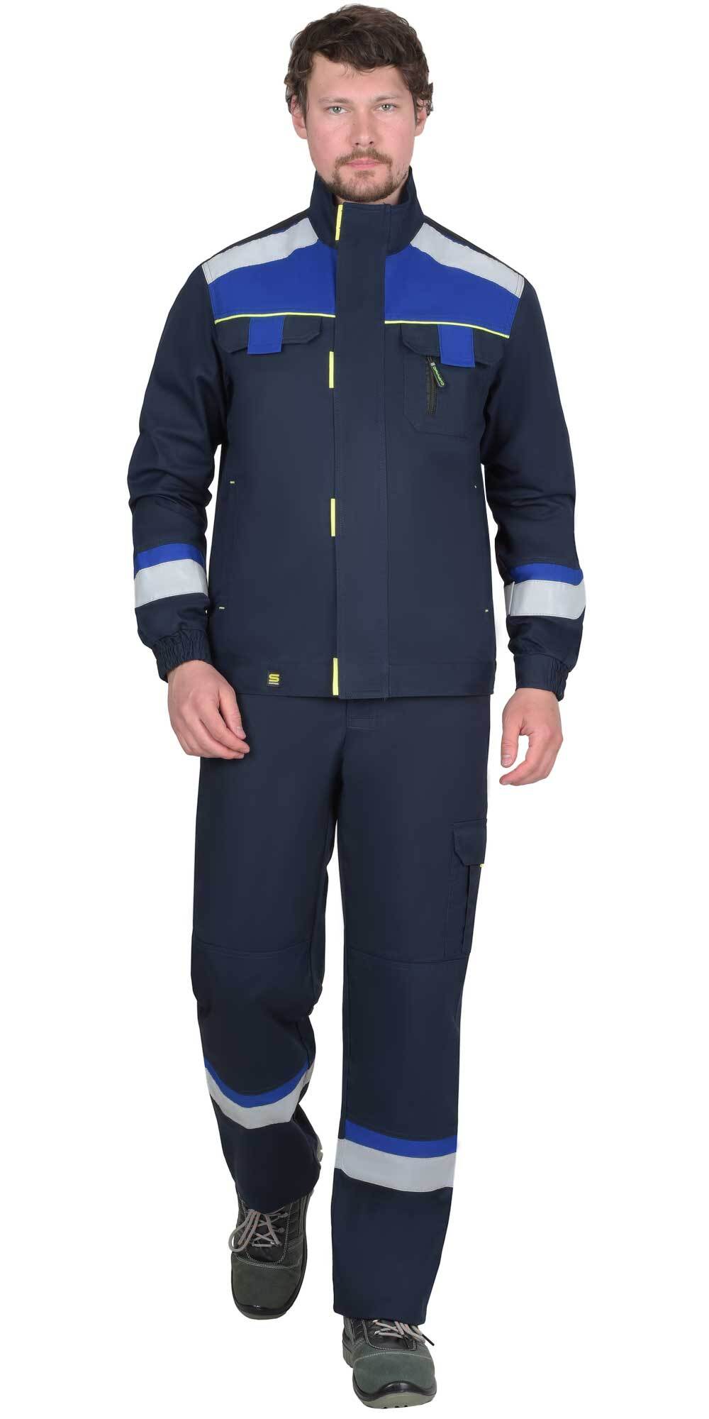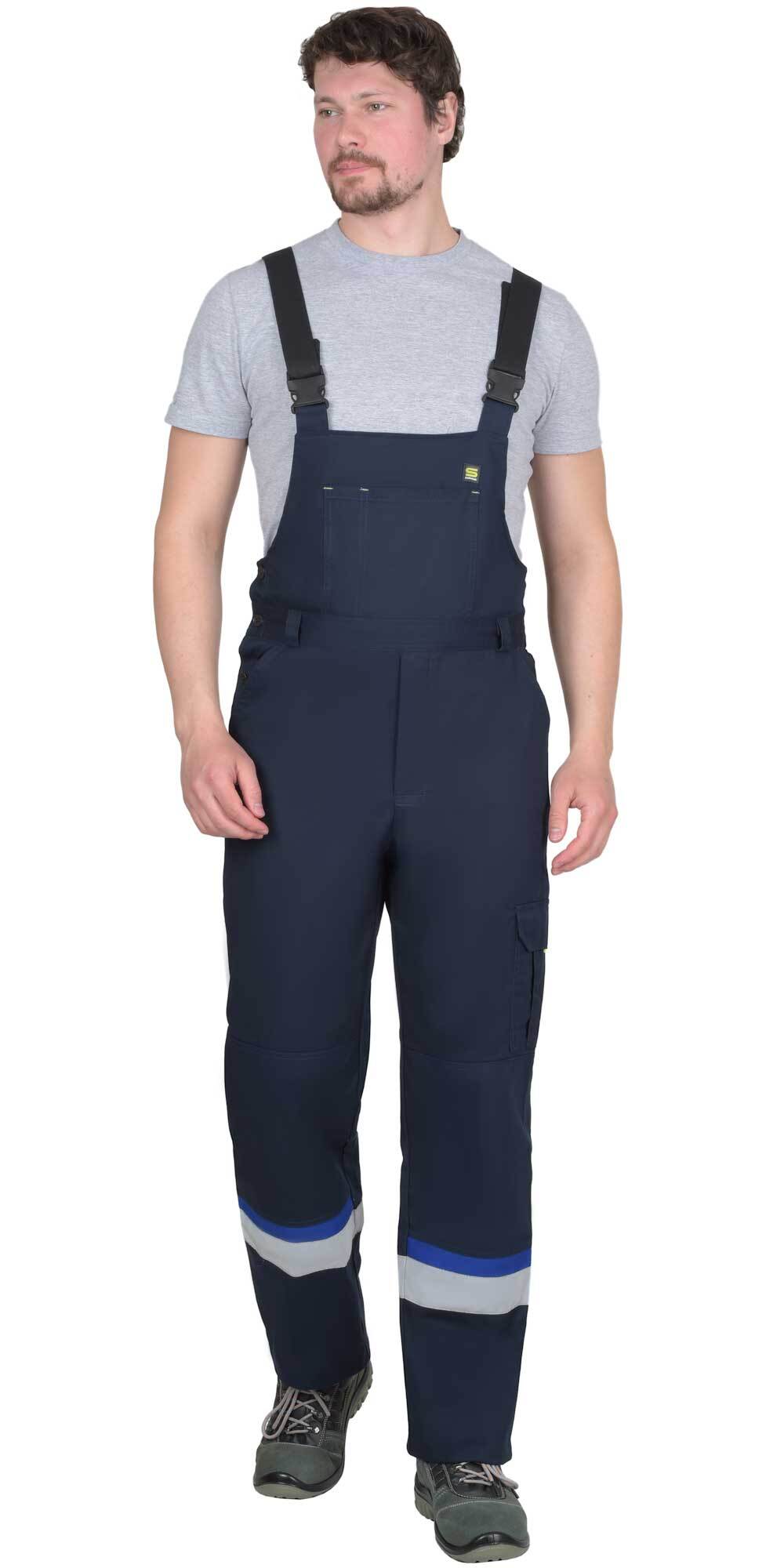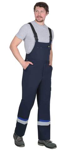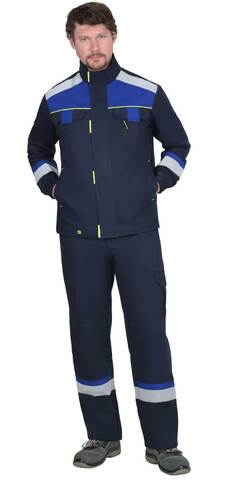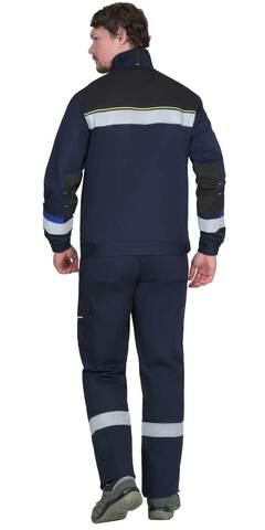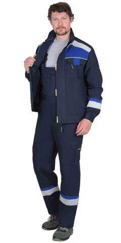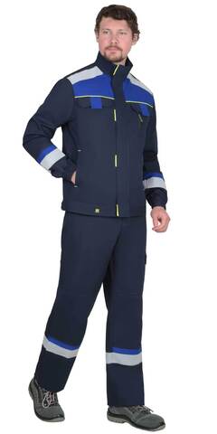 Куртка прямого силуэта, укороченная, с втачным воротником стойка, с центральной бортовой застёжкой на тесьму «молния», накрытую ветрозащитным клапаном на липучках, с нижними прорезными карманами с листочкой, с притачным поясом, регулирующимся по ширине при помощи хлястиков и липучки.Полукомбинезон с застёжкой спереди на три петли и три пуговицы и с застёжкой в правом боковом шве на три петли и три пуговицы, с нагрудным накладным карманом и боковыми, внутренними карманами, с накладным карманом на левом боковом шве с клапаном на липучке, с наколенниками, с двумя задними и карманами для инструментов, по спинке вставлена резинка.