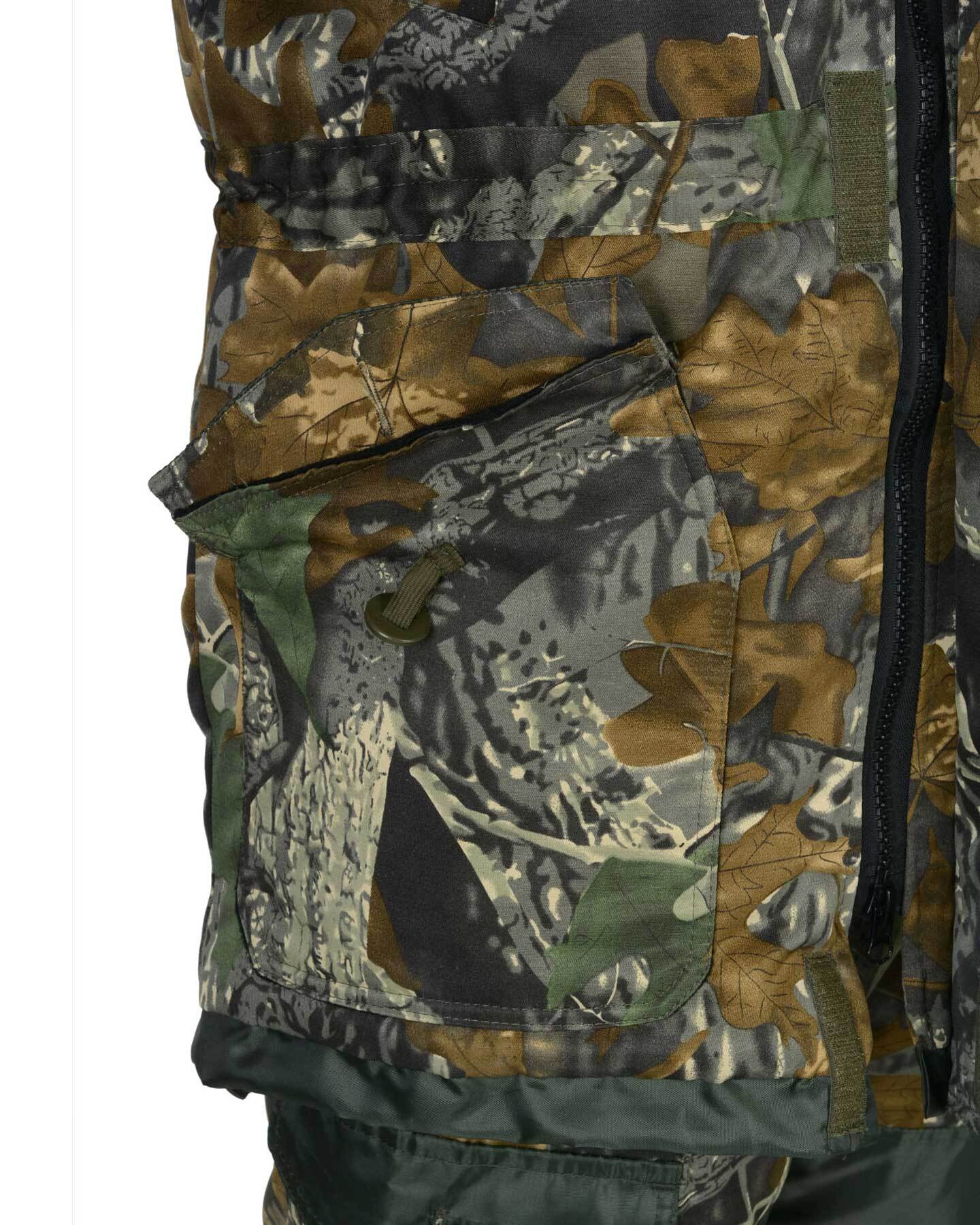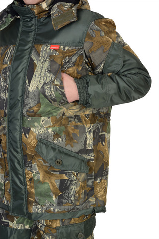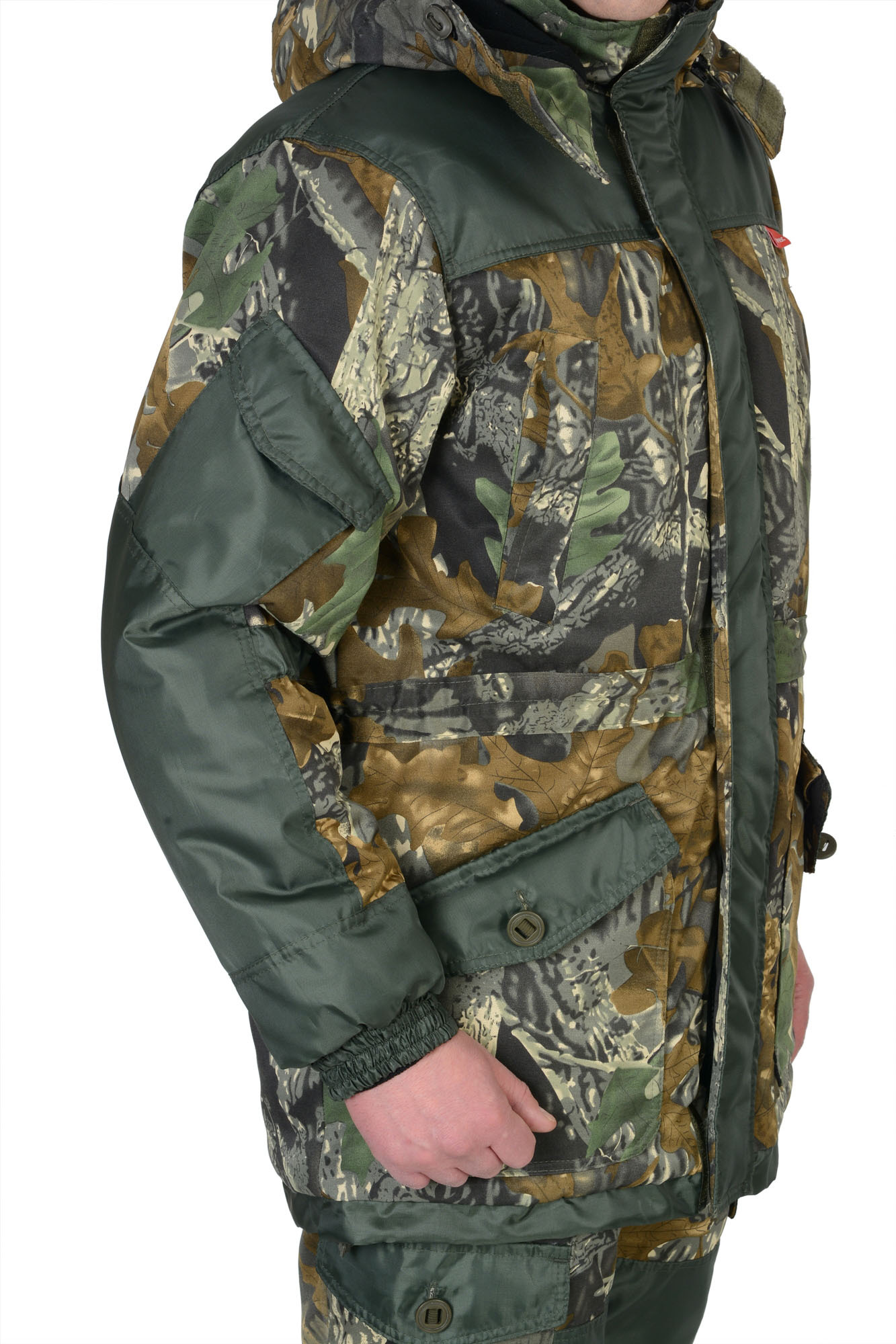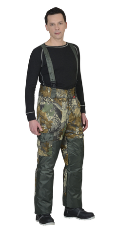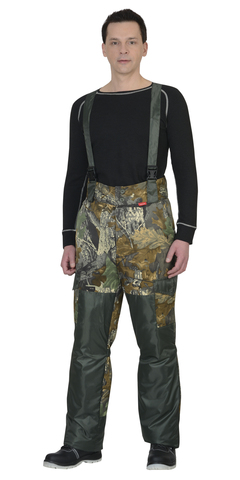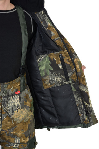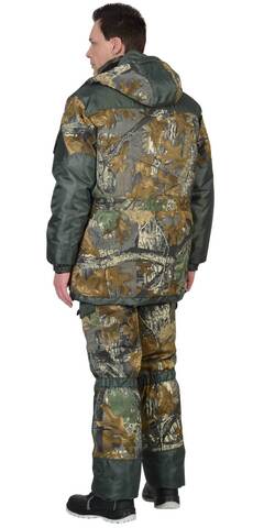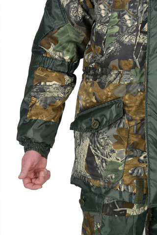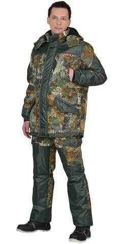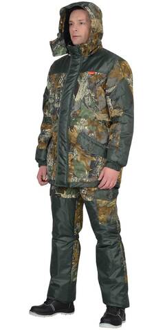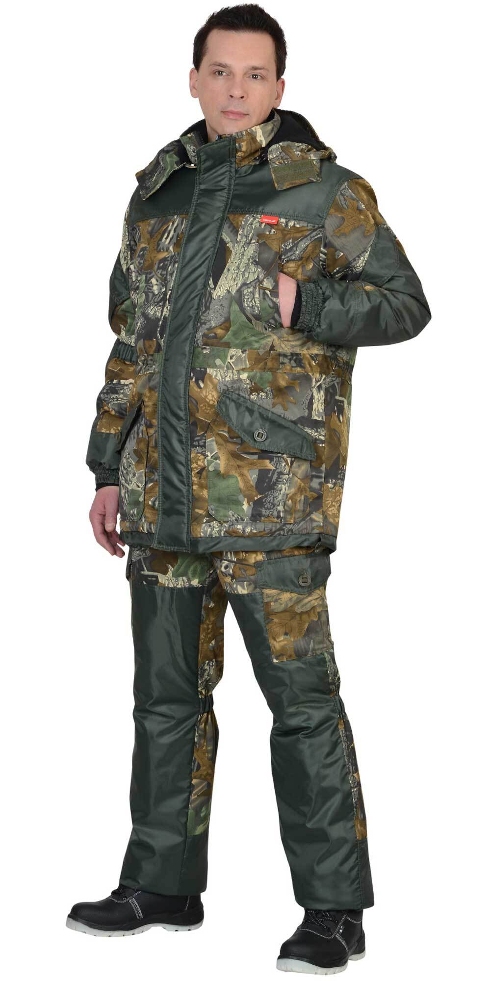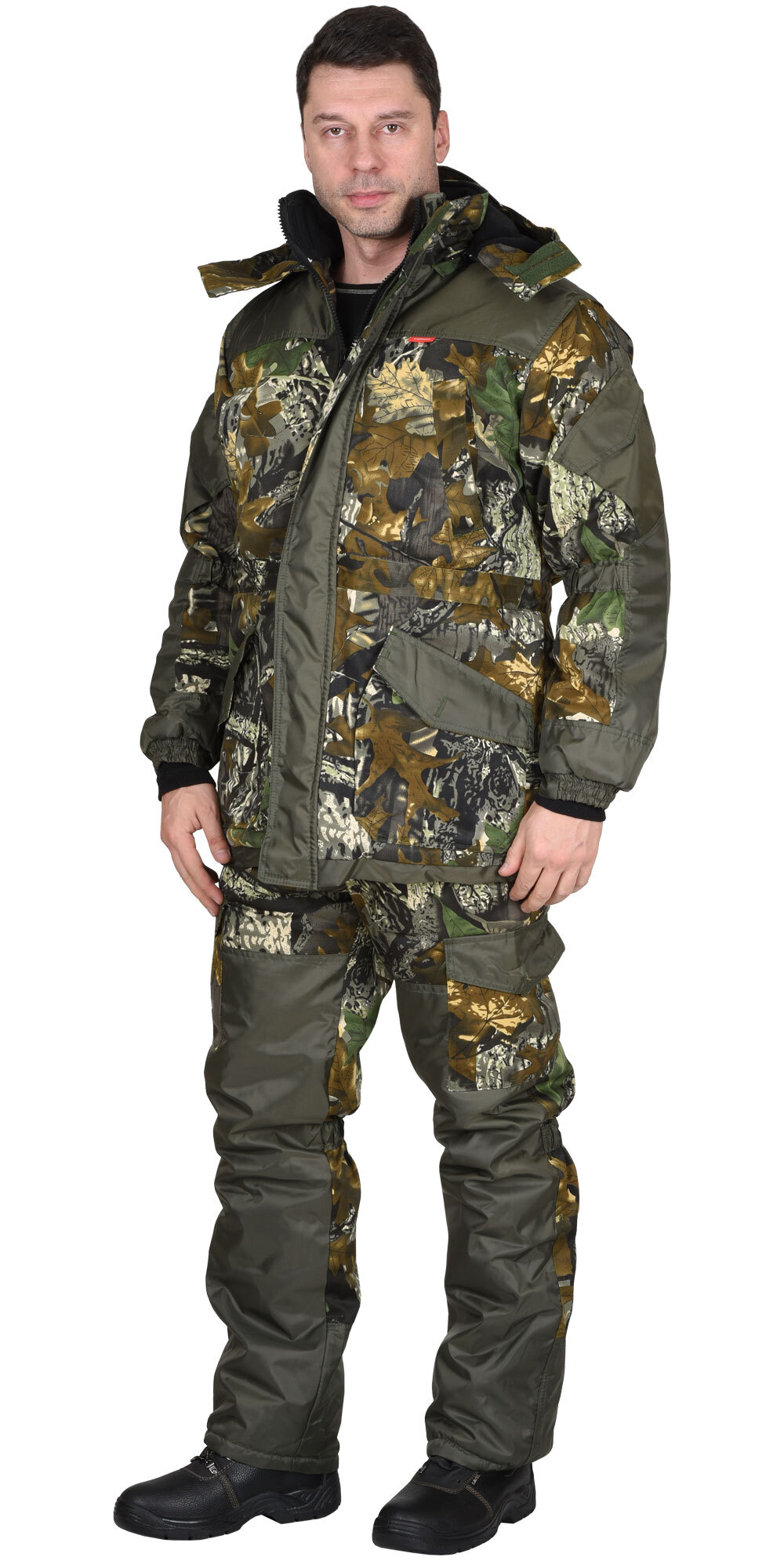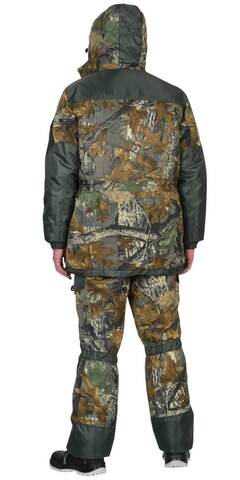 Куртка прямого силуэта; с притачной утепленной подкладкой, с центральной застежкой на двухзамковую тесьму - «молнию» и ветрозащитным клапаном застегивающийся на липучку, воротником – стойка, верхним прорезными карманами «листочка», с нижними накладными фигурными карманами антивор и фигурными клапанами застегивающиеся на канадскую пуговицу. Рукава с полуобъемными накладными карманами и фигурными клапанами застегивающимися на потайную липучку, с манжетами на резинке, с налокотниками. Капюшон с козырьком, двумя кулисами для регулировки, застежкой на потайную липучку. По талии и низу куртка регулируется шляпной резинкой и двойным фиксатором. На подкладке внутренний карман на молнии.Брюки с центральной застежкой гульфика на пуговицы, с притачным поясом застежкой на пуговицы, с пятью широкими шлевками, со спинкой и бретелями, с боковыми карманами с наклонным входом, с накладными карманами на боковых швах с фигурными клапанами застегивающиеся на канадскую пуговицу, с накладками передних половинок и накладками низа задних половинок.ГОСТ 12.4.236-2011Ткань: смесовая с ВО пропиткой 80% п/э, 20% х/б; пл.220 г/м2 Утеплитель: Синтепон: куртка-450 г/м2 , брюки-300 г/м2.