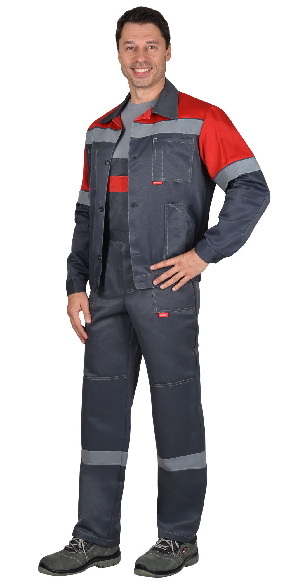 Костюм "СИРИУС-ЛЕГИОНЕР" куртка, п/к т.серый с красным СОП 50 мм
