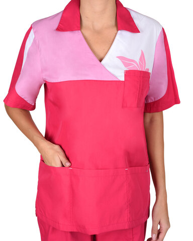 Костюм состоит из блузы и брюк. Блуза прямая с V-образным вырезом горловины и отложным воротником. С нижним накладным большим карманом, разделенным на три. Рукава короткие. Брюки прямые с притачным поясом стянутым резинкой и с отстроченными стрелками. ГОСТ 25294-2003