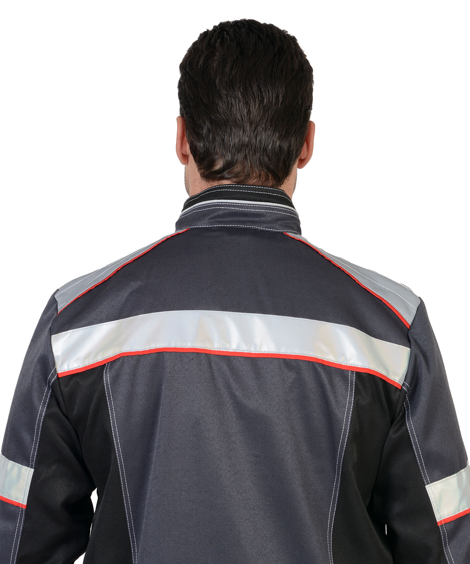 Ткань верха: полиэфирнохлопковая (смешанная) водоотталкивающая (ВО) пл.240 г/м.кв. состав 80% п/э 20% х/б, цвет темно-серый Ткань отделки 1: полиэфирнохлопковая (смешанная) водоотталкивающая (ВО) пл.240 г/м.кв. состав 80% п/э 20% х/б, цвет черный Ткань отделки 2: полиэфирнохлопковая (смешанная) водоотталкивающая (ВО) пл.240 г/м.кв. состав 80% п/э 20% х/б, цвет светло-серый Ткань отделки 3: полиэфирнохлопковая (смешанная) водоотталкивающая (ВО) пл.240 г/м.кв. состав 80% п/э 20% х/б, цвет красный Светоотражающий материал: лента СОП шириной 50мм и кант СВ
