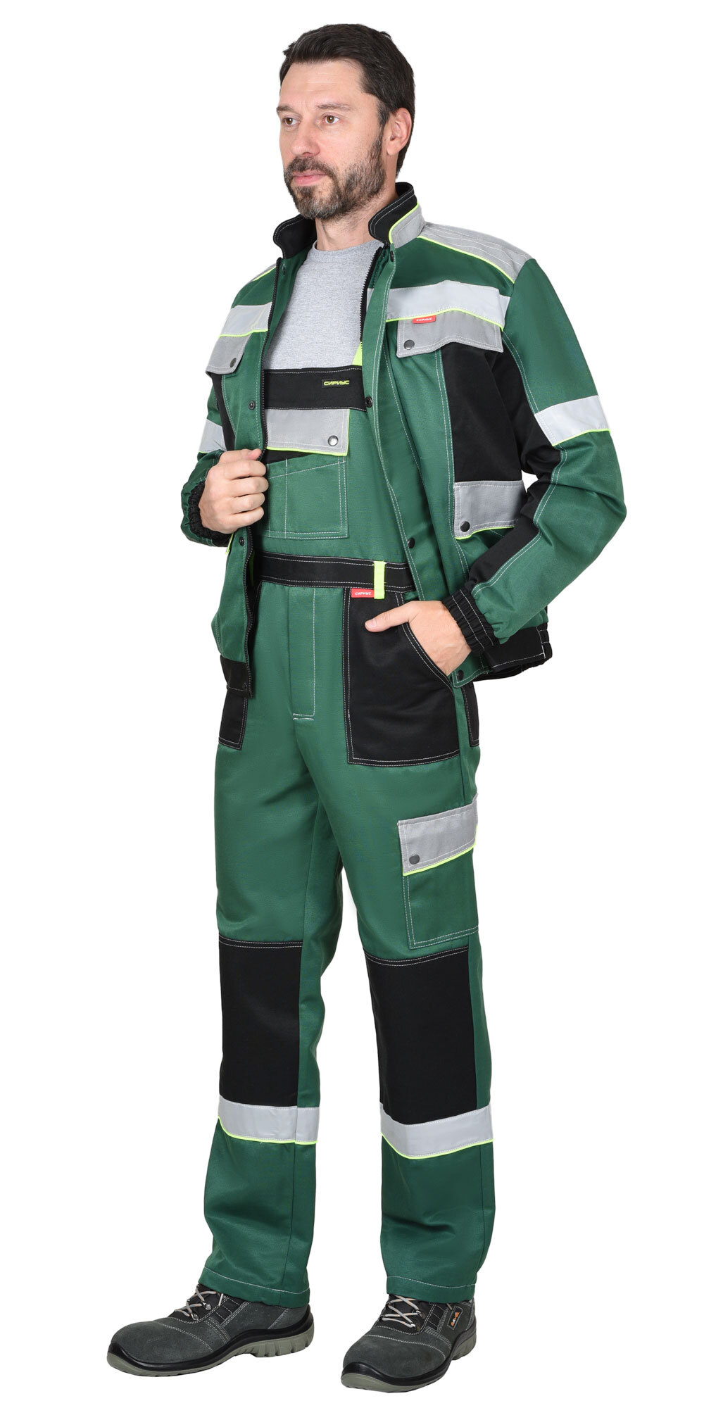 Костюм "СИРИУС-Полином":муж., кур. кор., п/к. зеленый с черным и св.серым и СОП 50мм.