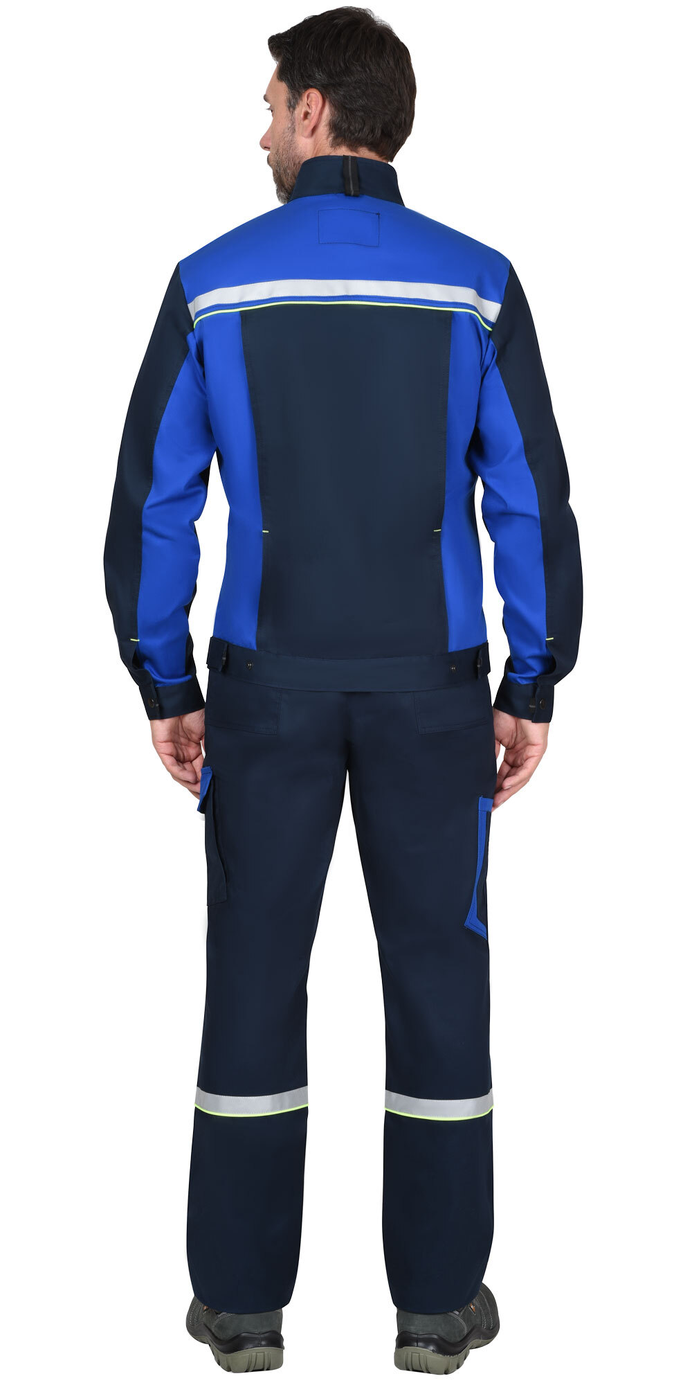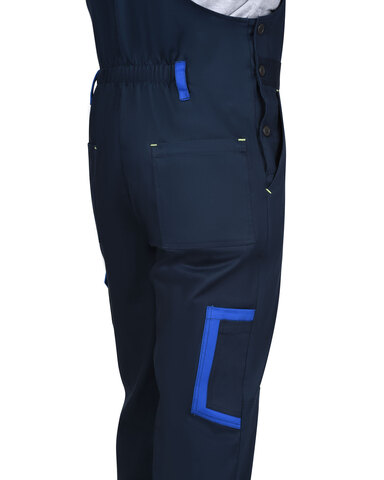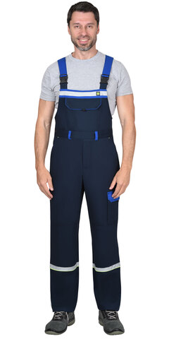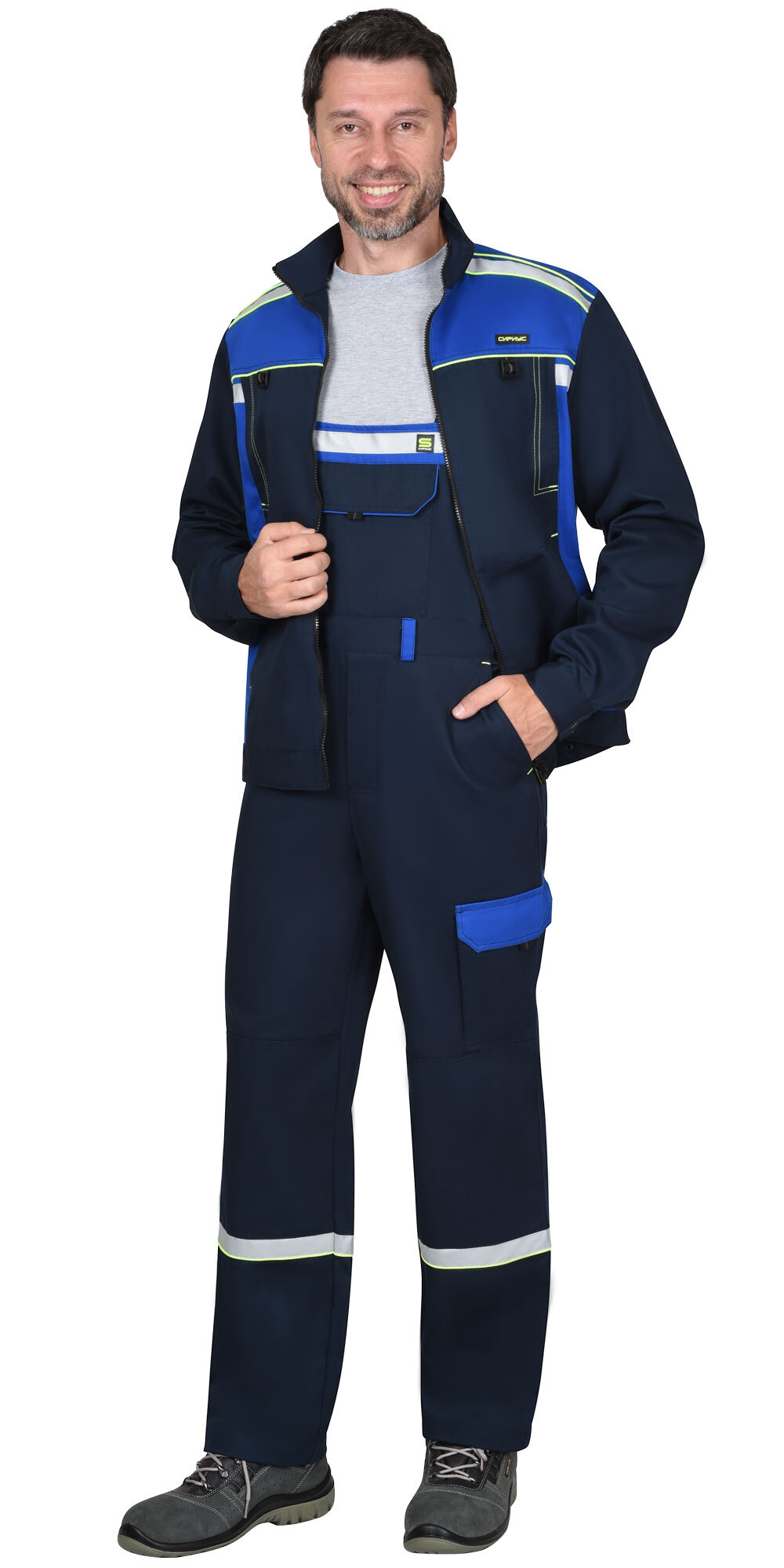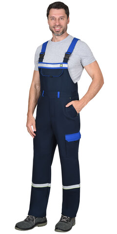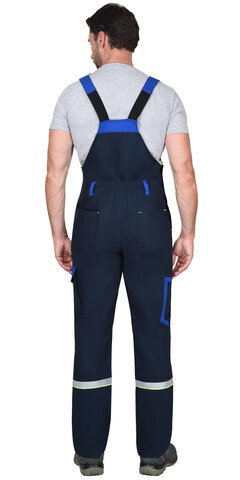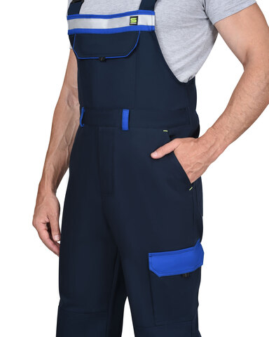 Полукомбинезон с застёжкой гульфика и застёжкой в правом боковом шве на три петли и пуговицы, верхним накладным карманом и нижними внутренними боковыми карманами, с наколенниками, с накладным карманом на левом боковом шве с клапаном на кнопке с патой, с двумя задними и карманами для инструментов, по спинке вставлена резинка.