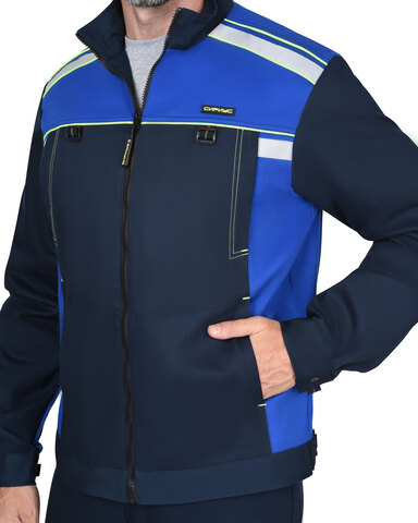 Куртка прямого силуэта, короткая, с воротником стойка, с центральной застёжкой на молнию, с подрезными бочками, с верхними и нижними карманами в швах, с притачным поясом регулирующимся по ширине при помощи хлястиков и кнопок. Рукава с манжетами на кнопках.
