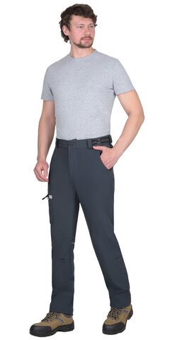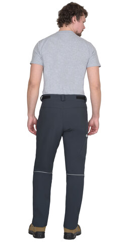 Брюки прямого кроя с застежкой гульфика на молнию, с отрезным поясом, с внутренними боковыми карманами и накладным карманом на правом боковом шве. В брюках предусмотрены светоотражающие элементы на накладном кармане и кант на задних половинках для обозначения сигнальной видимости в тёмное время суток.