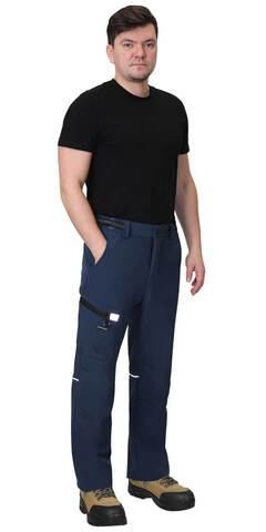 Брюки прямого кроя с застежкой гульфика на молнию, с отрезным поясом, с внутренними боковыми карманами и накладным карманом на правом боковом шве. В брюках предусмотрены светоотражающие элементы на накладном кармане и кант на задних половинках для обозначения сигнальной видимости в тёмное время суток.