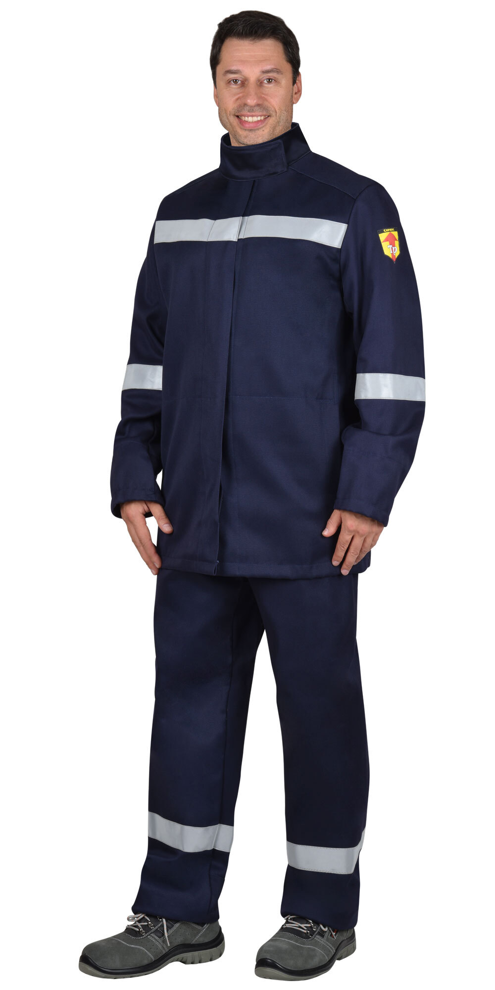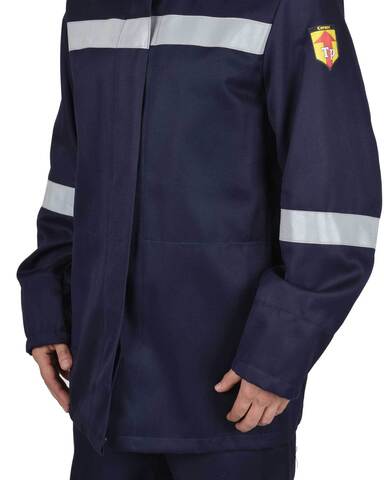 Костюм из огнеупорной ткани, состоит из куртки и брюк, на куртке и брюках предусмотрена огнеупорная светоотражающая лента шириной 50мм для обозначения сигнальной видимости.
