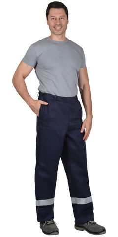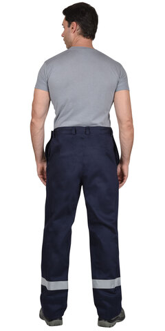 Брюки прямые, с застёжкой на пуговицы в боковых швах, с внутренними боковыми карманами, с вентиляционными отверстиями по шаговым швам в области сидения. Брюки с накладками на передних половинках переходящими по бокам на задние половинки и с накладками на задних половинках понизу и шаговым швам.