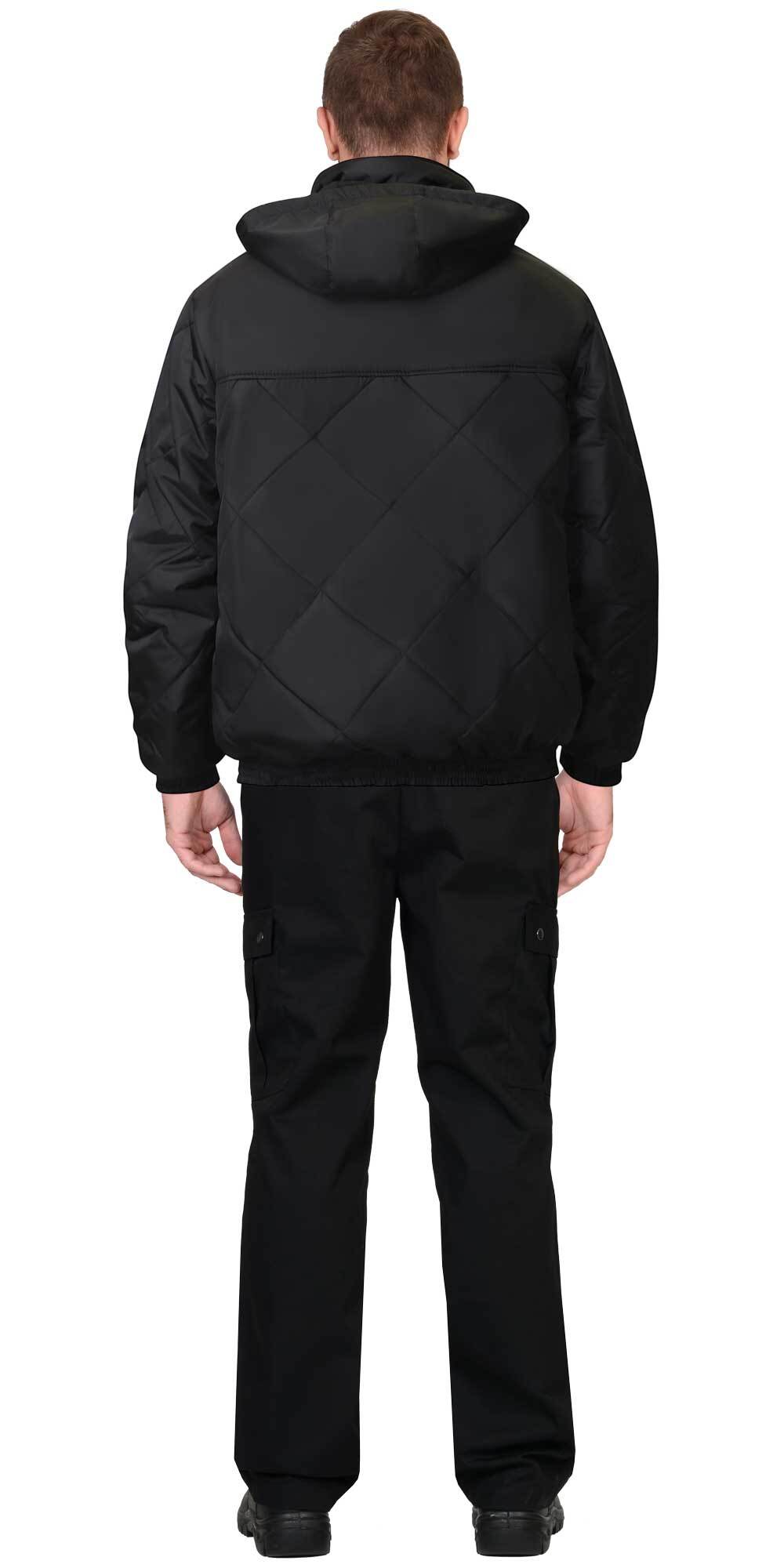Куртка утеплённая, укороченная, по низу на притачном поясе с эластичной лентой, на подкладке из флиса, со съёмным капюшоном, с центральной бортовой застёжкой на молнию и воротником стойка. Изделие с верхним нагрудным прорезным и нижними накладными карманами. Рукава втачные с притачными манжетами, манжеты частично стянуты на эластичную ленту. Полочки, спинка, рукава и нижние карманы куртки выстеганы с утеплителем в виде ромбов.