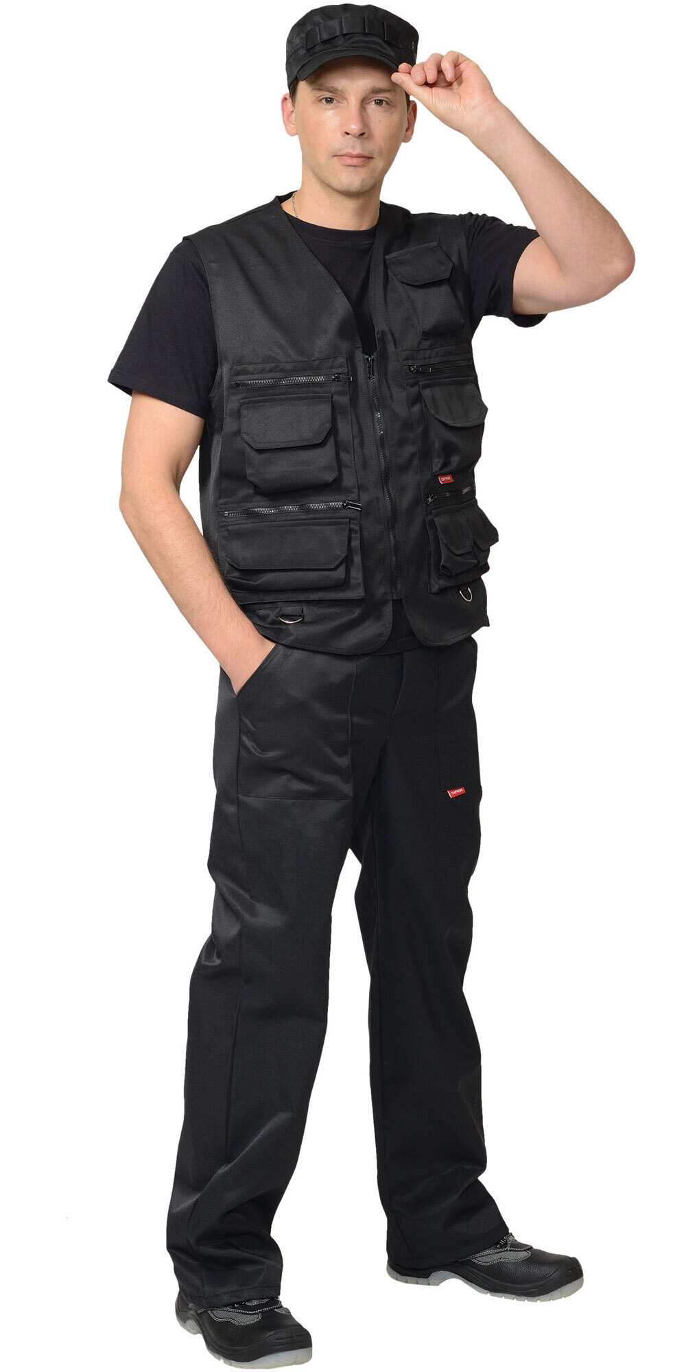 Жилет с V-образным вырезом горловины; с центральной застёжкой на тесьму - «молнию»; с различными многофункциональными карманами с объёмами и с клапанами на «липучках; хлястиками и держателями с полукольцами; фигурным низом. Ткань верха: «Crown» смесовая с ВО пропиткой; состав: 80 % п/э, 20% х/б. ТУ 8550-001-81391241-2008
