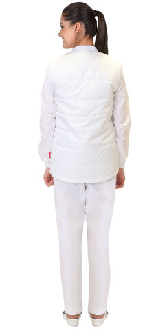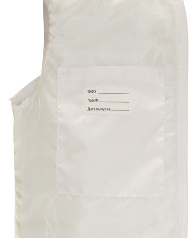 Жилет утепленный прямого силуэта на подкладке, с трикотажным воротником стойкой, центральной бортовой застежкой на тесьму "молния" и внутренним накладным карманом. Предназначен для работы в холодных помещениях пищевого производства. ГОСТ 25295-2003