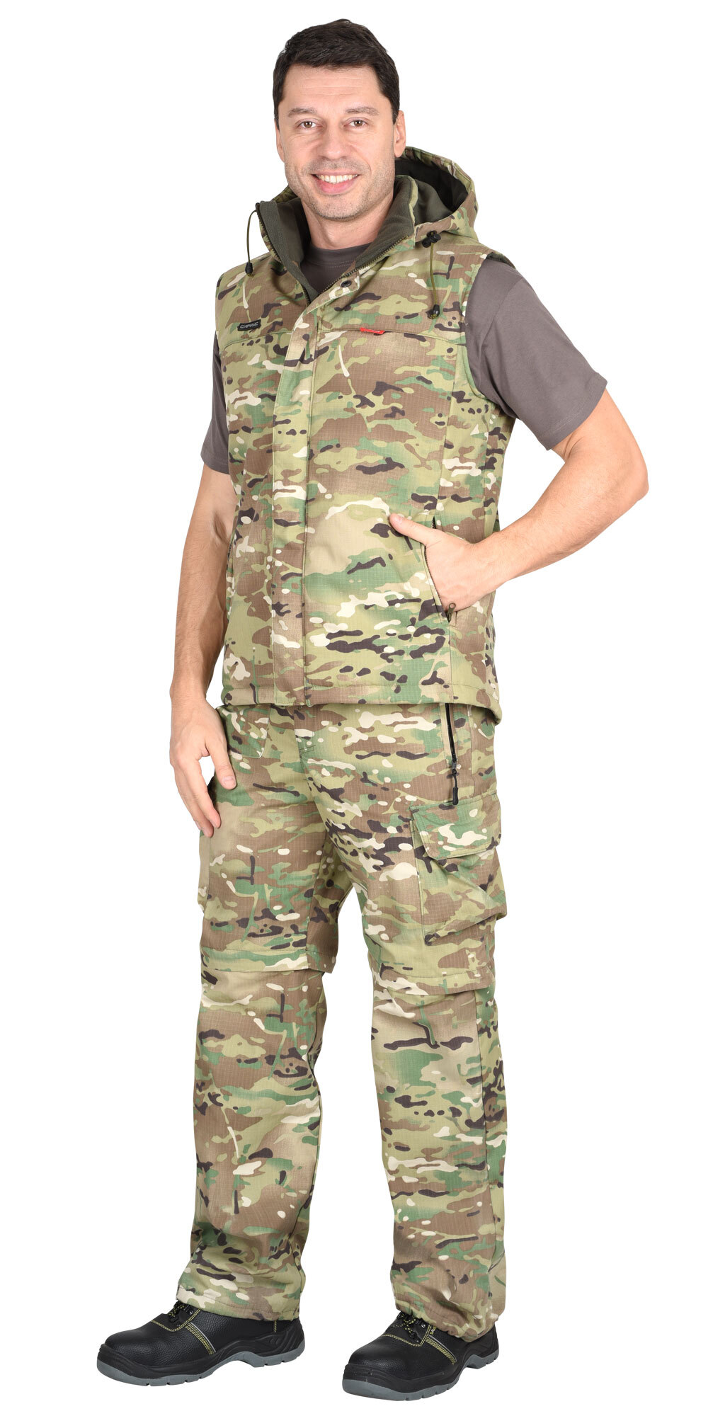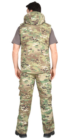 Жилет утепленный, полуприлегающего силуэта, с центральной бортовой застёжкой на тесьму - «молнию», с ветрозащитной планкой застегивающийся на потайные кнопки, с пристёгивающимся капюшоном, с нижними карманами на тесьму - «молнию» в рельефах, с внутренним карманом застегивающийся на тесьму «молнию». Ткань верха: «Рип - Стоп» состав: 65% п/э, 35% х/б; Ткань: «Флис» состав: 100% п/э,Утеплитель: «Синтепон» пл. 150г/м2 ГОСТ 25295-2003