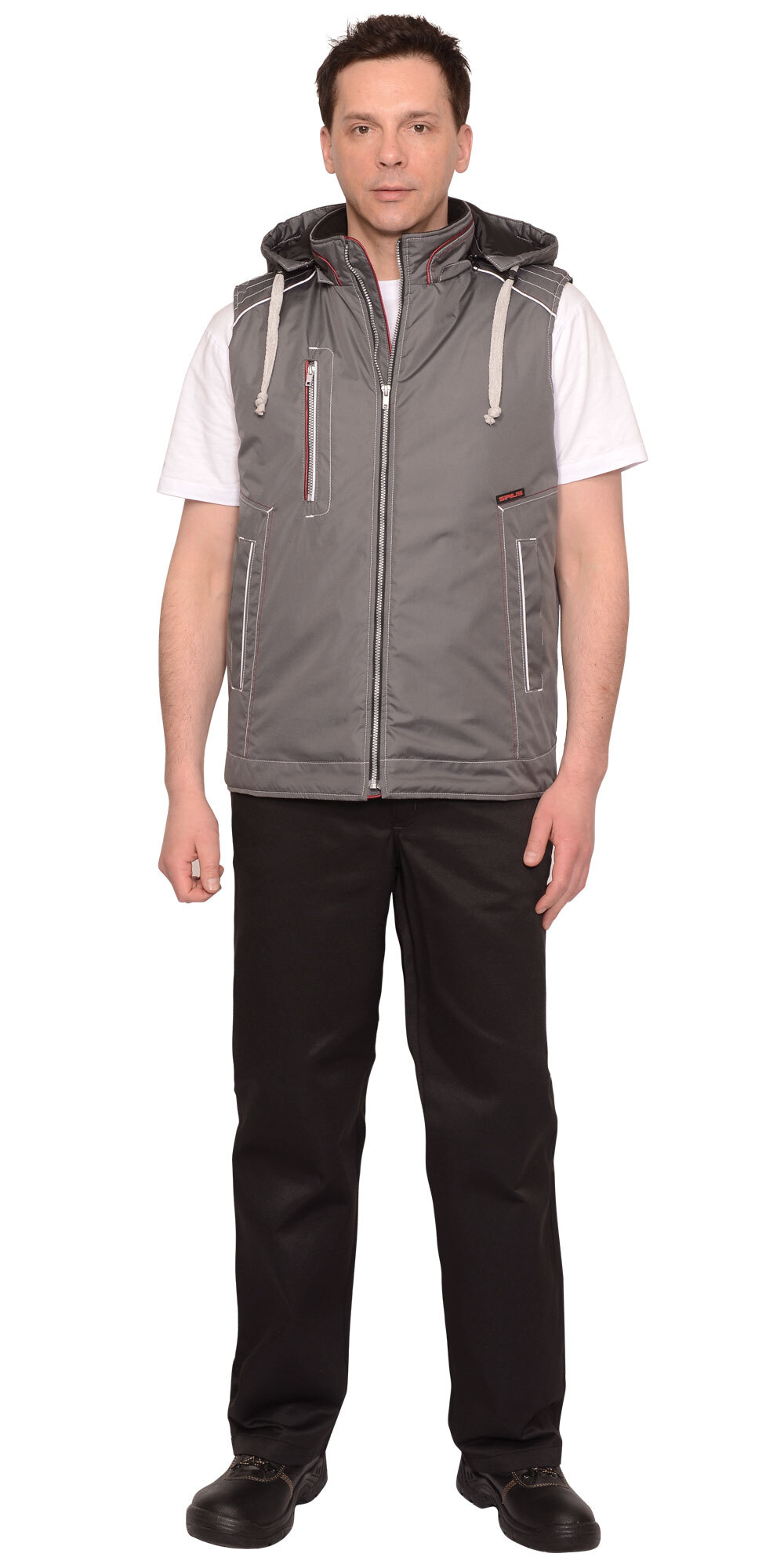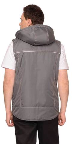 ГОСТ 25295-2003, ТР ТС 017/2011 Жилет, с утеплённой подкладкой, однотонный с отделочными строчками и отделочным кантом контрастного цвета. Жилет с воротником стойка, с застёжкой на молнию, с внутренним ветрозащитным клапаном, со съёмным капюшоном, который пристёгивается к воротнику на молнию. Спинка жилета, удлинённая с фигурной линией низа. Жилет с одним нагрудным карманом с молнией и двумя нижними боковыми карманами. Внутренний воротник из флиса. Объём капюшона по лицевому вырезу регулируется шнуром с фиксаторами. Подкладка с утеплителем, с внутренним карманом с молнией. В жилете предусмотрен световозвращающий кант, что обеспечивает видимость при любом освещении.