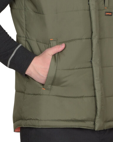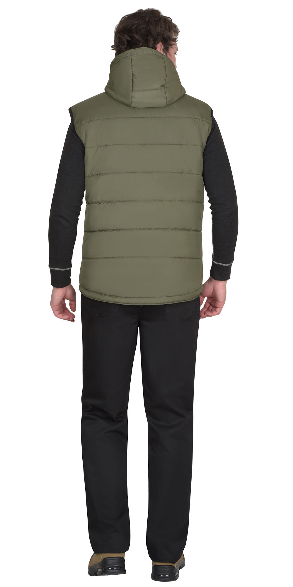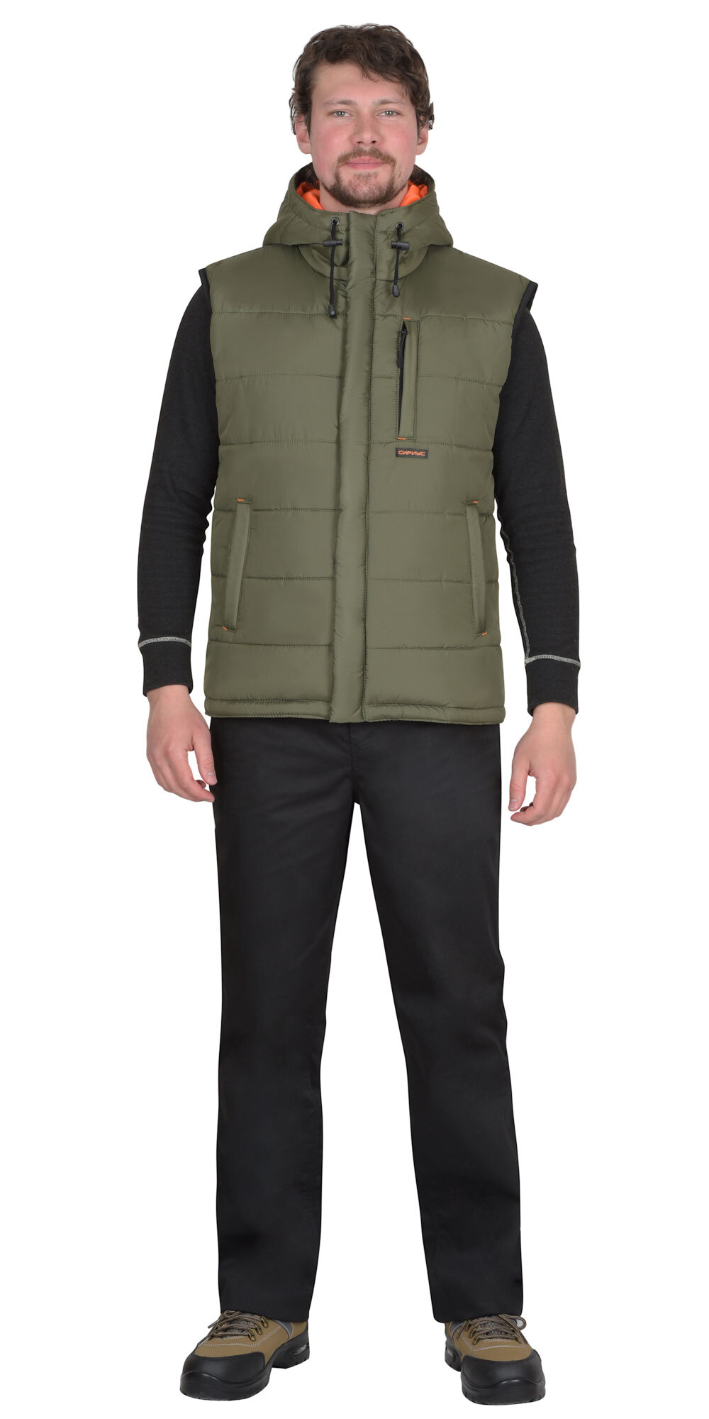 ГОСТ 25295-2003, ТР ТС 017/2011 Жилет утеплённый, выстеган с утеплителем горизонтальными строчками, на подкладке контрастного цвета, с втачным капюшоном, с застёжкой на молнию, закрытую ветрозащитным клапаном от края капюшона до низа изделия, застёгивающимся на кнопки. Жилет с одним нагрудным карманом с молнией и двумя нижними карманами. Спинка жилета, удлинённая с фигурной линией низа. Пройма окантована резинкой. Объём капюшона по лицевому вырезу регулируется шнуром с фиксаторами. Жилет может использоваться как для активного отдыха, так и для работы в неотапливаемых помещениях или на открытом воздухе в осенне-зимний период. Удобный крой не затрудняет движений.