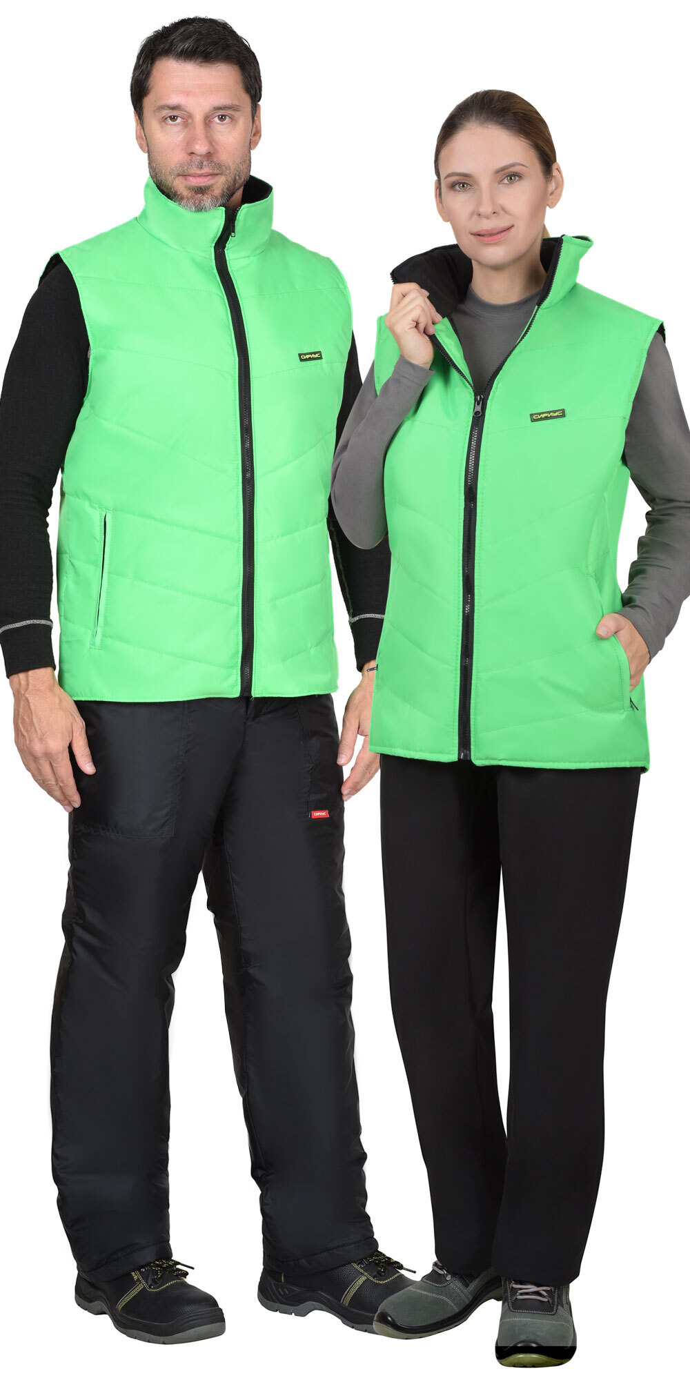 ГОСТ 25295-2003, ТР ТС 017/2011 Жилет утеплённый, стёганый, прямого силуэта, с застёжкой на молнию, с подкладкой, с боковыми прорезными карманами, застёгивающимися на молнию, с внутренним карманом с молнией, с воротником стойка, внутренний воротник из «флиса» для комфорта в области прилегания к шее. Спинка удлинённая относительно полочек с фигурной линией низа. Жилет может использоваться как для активного отдыха, так и для работы в неотапливаемых помещениях или на открытом воздухе в осенне-зимний период. Удобный крой не затрудняет движений.
