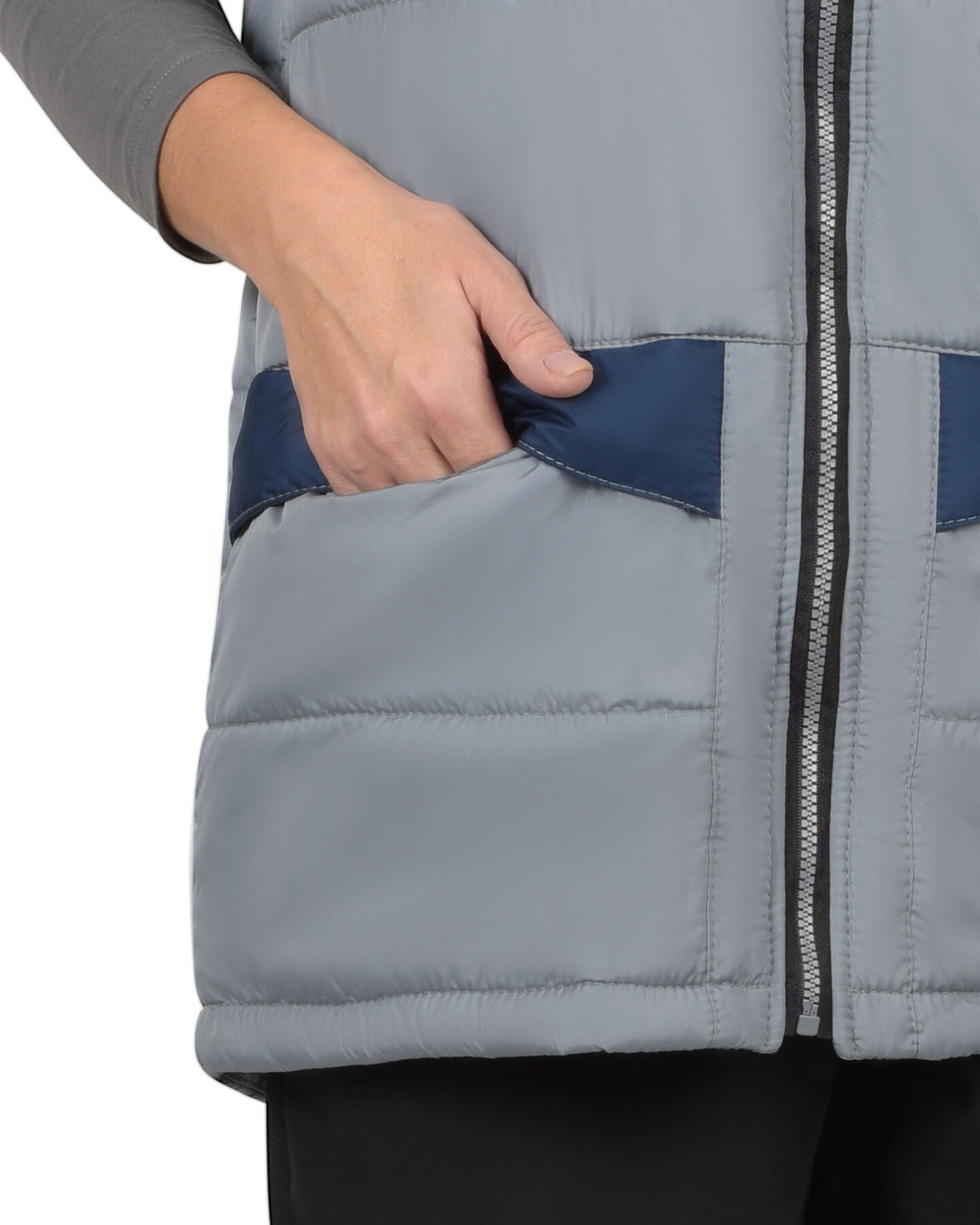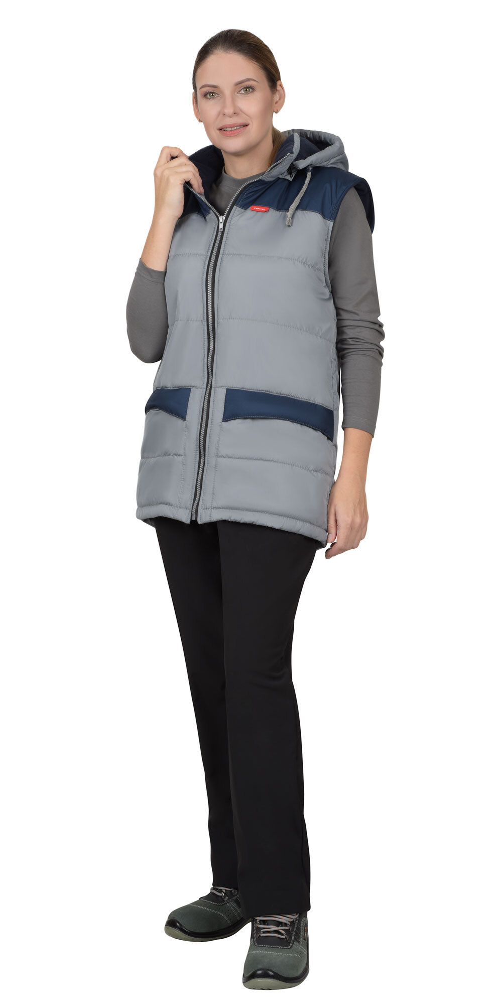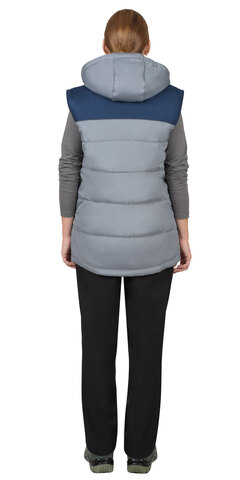 ГОСТ 25295-2003, ТР ТС 017/2011 Жилет двухцветный, утеплённый, стёганый, прямого силуэта, удлинённый, с застёжкой на молнию, с воротником стойка, со съёмным капюшоном, с карманами с клапанами, с внутренним карманом на молнии. Внутренний воротник из «флиса» для комфорта в области прилегания к шее. Спинка удлинённая относительно полочек с фигурной линией низа. Подкладка жилета и капюшона из флиса. Капюшон пристёгивается к жилету при помощи молнии, объём капюшона по лицевому вырезу регулируется шнуром с фиксаторами. Жилет может использоваться как для активного отдыха, так и для работы в неотапливаемых помещениях или на открытом воздухе в осенне-зимний период. Удобный крой не затрудняет движений.