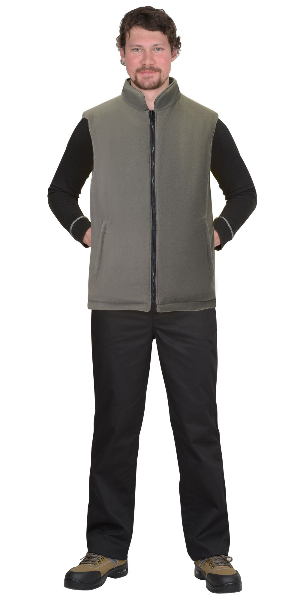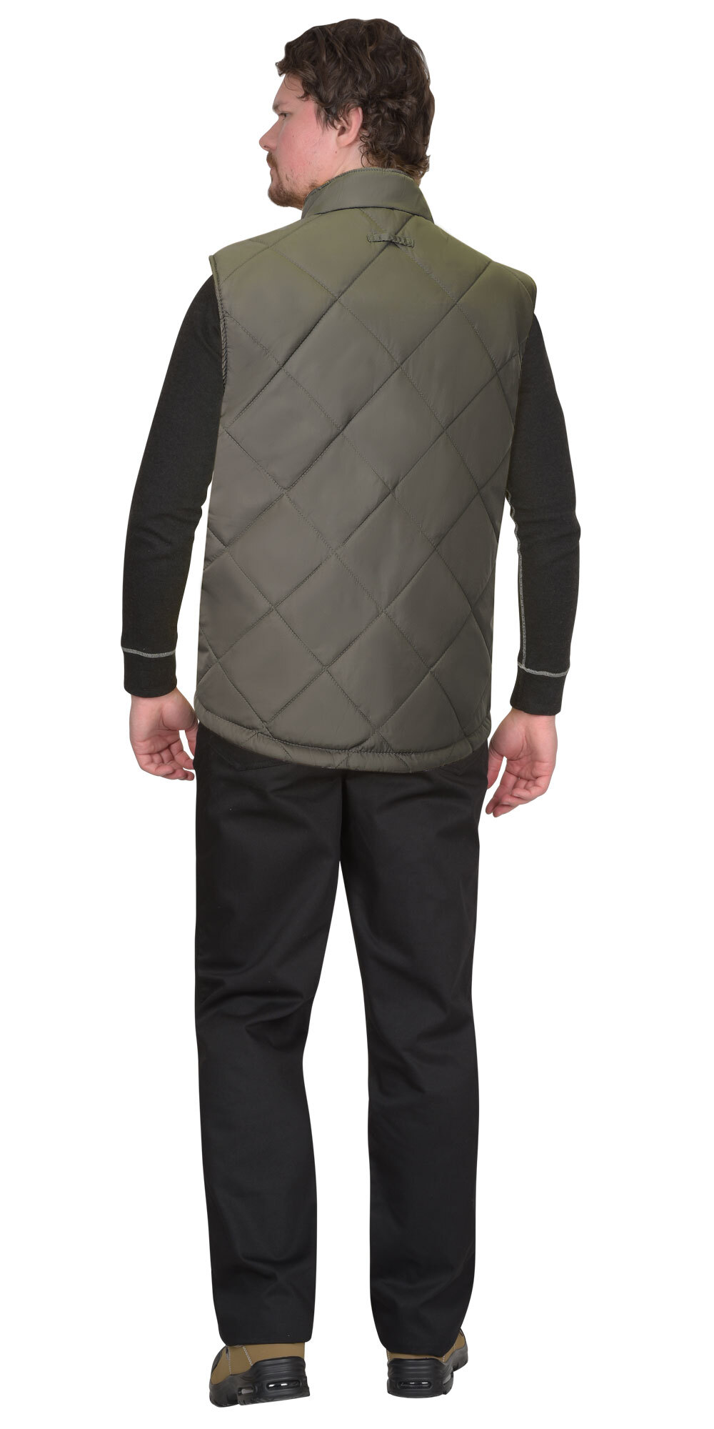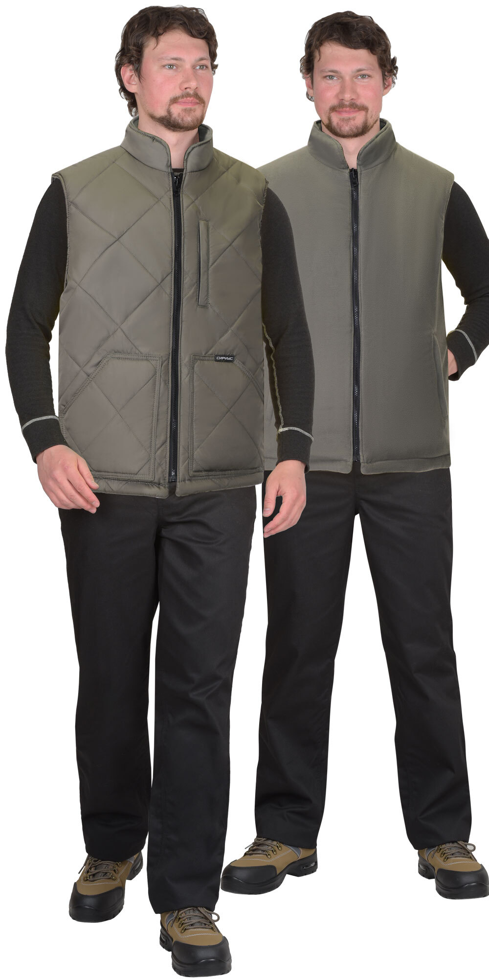 ГОСТ 25295-2003, ТР ТС 017/2011 Жилет утеплённый, двухсторонний, одна сторона жилета стёганая в виде ромбов из курточной ткани с водоотталкивающей пропиткой, другая – из флиса. Жилет прямого силуэта, с застёжкой на молнию с перекидным замком, с воротником стойка, спинка жилета, удлинённая по отношению к переду, с фигурной линией низа. Стёганная сторона жилета с одним нагрудным карманом с молнией и двумя большими накладными карманами с наклонным входом. Сторона жилета из флиса с прорезными боковыми карманами с молнией. Жилет может использоваться как для активного отдыха, так и для работы в неотапливаемых помещениях или на открытом воздухе в осенне-зимний период. Удобный крой не затрудняет движений.